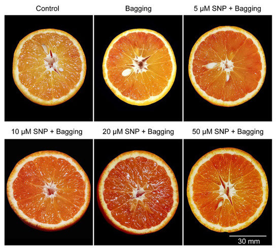 For the bagged fruit and NO-treated fruit, there were significantly more red color in the blood orange pulp than in that of the control. However, the concentrations of SNP lower than 10 μM or higher than 50 μM showed less effects to the pulp color, compared with 20 μM (Figure 1). Our results suggest that 20 μM was the optimal concentration of SNP to promote color formation in blood orange fruit.