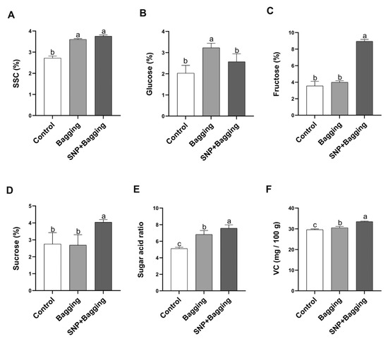 As shown in Figure 3, bagging and NO treatment increased the content of soluble sugar (SSC) in fruits (Figure 3A). The glucose content of the bagged fruit increased by 1.59 times, compared to the control. However, NO treatment inhibited the accumulation of glucose, which was the same result as the control treatment (Figure 3B). NO treatment increased the fructose content, which was 2.52 times that of the control (Figure 3C). Moreover, NO treatment increased the sucrose content in fruit (Figure 3D). However, the contents of fructose and sucrose were similar between the bagged fruit and the control. NO treatment increased the sugar–acid ratio and VC content of fruits (Figure 3E,F), and the sugar–acid ratio of fruits treated with NO was 1.48 times higher than that of the control.