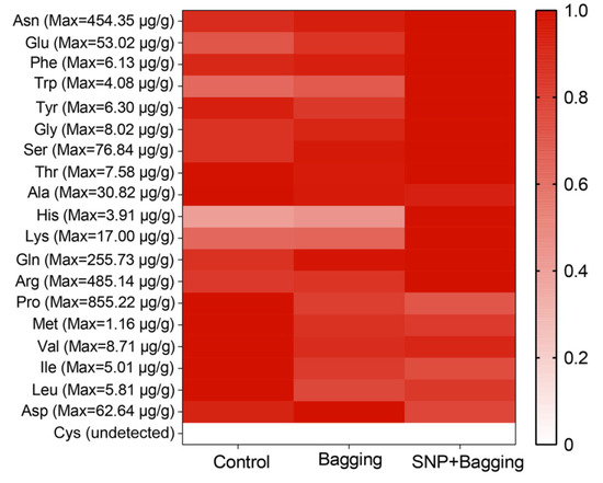 NO treatment enhanced the contents of threonine, phenylalanine, glutamine, arginine, tyrosine, serine, glycine, asparagine, lysine, tryptophan, tryptophan, glutamic acid, and histidine (Figure 4). Among them, the histidine content in the fruit increased most significantly (by 1.09 and 3.23 times, respectively) after bagging and NO treatment. In the bagged and NO-treated fruit, the contents of leucine, isoleucine, aspartic acid, methionine, valine, proline, and alanine were reduced (Figure 4). In particular, the content of proline in the bagged and NO-treated fruit was dramatically reduced to 158.65 µg/g and 243.77 µg/g, respectively, less than that of the control. Moreover, cystine was not detected in the fruit.