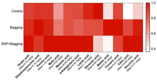 Heatmaps of organic acids in blood orange fruits after different treatments. The bar represents the relative value (measured value/max value × 100%).