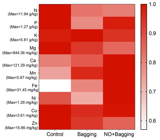 The content of Ca, Fe, Zn, and Ni increased in the bagged and NO-treated fruit (Figure 6), and the Fe content increased the most, by 1.27 and 1.75 times, respectively. The Ca content increased by 1.10 and 1.26 times in the bagged and NO-treated fruit, respectively, compared with the control. In addition, the content of N and Mg decreased, and the content of N decreased substantially. The contents of P and Mn also decreased in bagged fruit. Interestingly, there was no significant difference in the Cu content between different treatments (Figure 6).