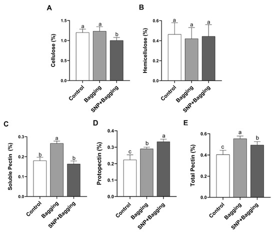 NO treatment reduced the cellulose content in fruit, but the cellulose content of bagged fruit was consistent with that of the control (Figure 7A). The hemicellulose content was similar across the different treatments (Figure 7B). The content of soluble pectin increased by 1.46 times in bagged fruit, compared with the control, but the soluble pectin in the NO-treated fruit was similar to that of the control (Figure 7C). The original pectin content in the bagged and NO-treated fruit increased by 1.30 times and 1.48 times, respectively (Figure 7D). Moreover, the total pectin content in the bagged and NO-treated fruit also increased (Figure 7E).