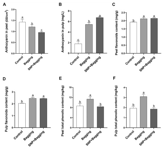 The accumulation of anthocyanins in the peel of bagged and NO-treated fruit was inhibited (Figure 8A). However, the anthocyanin content in the pulp followed the opposite trend of that in the peel. The content of anthocyanins in the pulp increased by 3.07 times and 3.80 times in the bagged and NO-treated fruit, compared with the control, respectively (Figure 8B). Bagging and NO treatment increased the total flavonoid content in the fruit peel and pulp (Figure 8C,D). The total phenol content in the pulp of bagged fruit increased by 1.31 times, compared with the control (Figure 8E). The total phenolic content in the peel or pulp of NO-treated fruit was similar to that of the control (Figure 8E).