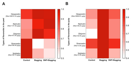 The contents of hesperetin, narirutin, and didymin in the peel of bagged and NO-treated fruit increased, but the contents of sinensetin and nobiletin in the peel decreased (Figure 9A). Bagging treatment and NO treatment also increased the contents of hesperetin, narirutin, and didymin in the pulp (Figure 9B). In particular, the content of didymin was 2.53 times and 1.75 times higher than that of the control treatment in bagged and NO-treated fruit, respectively. Bagging treatment increased the contents of sinensetin and nobiletin in the pulp by 1.16 and 1.66 times, respectively. After NO treatment, the contents of sinensetin and nobiletin in pulp were similar to those in the control.