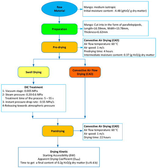 The drying protocol of mangoes has been described in Figure 1. The pre-drying and the Instant Controlled Pressure Drop experiments were performed at the LaSIE (Laboratory of Engineering Science for the Environment of the University of La Rochelle in France).