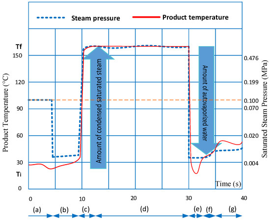 DIC stages applied on mangoes: (a) placement of samples into the reactor under atmospheric pressure; (b) establishment of initial vacuum; (c) injection of saturated steam; (d) holding of target saturated steam pressure; (e) instant controlled pressure drop towards the vacuum; (f) holding of vacuum; (g) release of samples at atmospheric pressure.