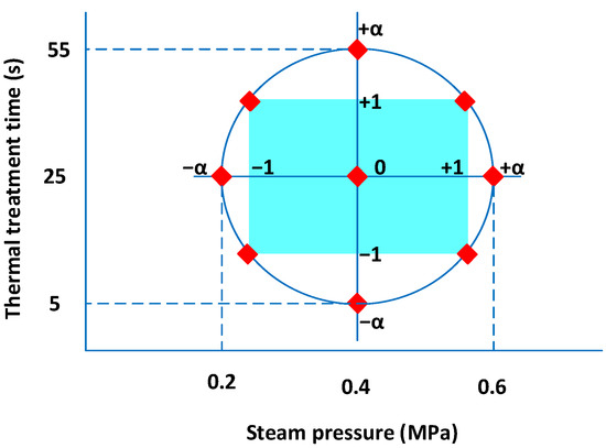 A five-level central composite rotatable experimental design was used to assess the effect of DIC operating parameters on drying kinetics. After preliminary tests, the saturated vapor pressure “P” (MPa), with a range between 0.2 and 0.6 MPa, and the treatment time of the process “t” (s) between 5 and 55 s, were used as independent variables (n = 2). Thus, the studied design included 11 experiments: 4 factorial points (;+1/−1, and +1/+1); 4 start trials (; and 3 central points (0,0). The value of α (axial distance) was determined as a function of the number (n) of operating parameters, and it was calculated as . Figure 4 shows the selected independent variables at five levels of (, −1, 0, +1, ), and Table 1 shows the applied experimental design.