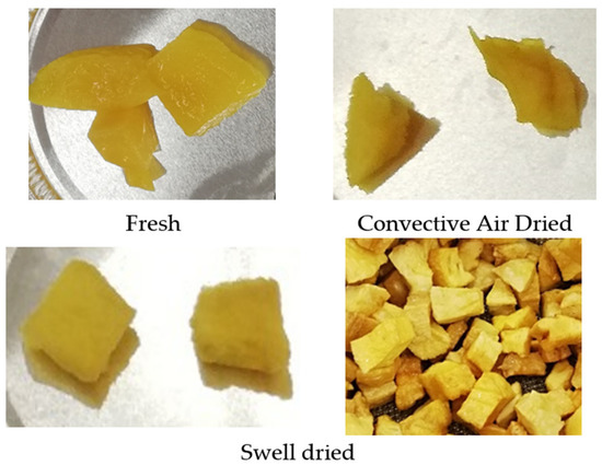 Photographs of Fresh, Convective Air-Dried, and Swell-Dried mangoes.