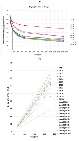 (A) Drying curves of raw material (RM) and swell-dried mangoes (DIC) and (B)–ln(Y) vs. time (min) plot.