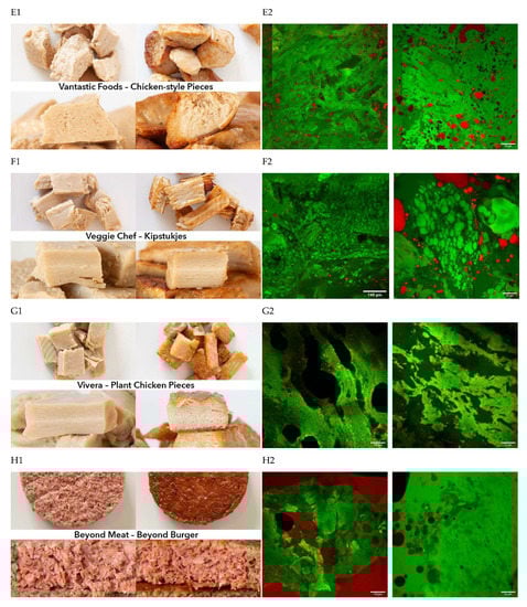 To gain insights into differences in structure among the studied meat analogues, we used microscopy to visualize the fat phase (in red) and the morphology of the protein network (in green). By taking samples from the middle of the products (as opposed to sampling from the edge), we assume that the images reliably reflect the microstructure. In Figure 1, pictures of the general appearance of a selection of meat analogues are provided, together with CLSM micrographs. The latter clearly show for all samples fibrouslike or layered structures, as well as randomly oriented coarsely connected protein networks. For example, a fibrouslike structure is clearly visible in AH Pieces Like Chicken, made of wheat protein (Figure 1A). This type of structure is most likely obtained by extrusion [39]. Wheat gluten has been reported to enhance fibrous structural arrangements in meat analogues [19,49]. Similar structured domains were also observed for Vantastic Foods pieces, which also contain wheat protein (Figure 1E). However, also pieces without wheat showed fibrouslike structures, such as the Greenway Chick Pieces (Figure 1B), which consisted of soy only. These fibrous structures can easily be seen in the images in Figure 1B1. Veggie Chef (Figure 1F) and Vivera Pieces (Figure 1G) showed limited fibrelike structures and a more course protein network, even though they also consisted mainly of soy. A very interesting image was obtained for Quorn Pieces (Figure 1C), revealing a homogeneous distribution of very small mycoprotein fibres. The protein structure of meat analogues is thus determined not only by the composition, but also by the specific processing conditions [14,17,39]. The fat phase of the analogue pieces was distributed as small droplets throughout the samples, except for AH (A) and Veggie Chef (F).