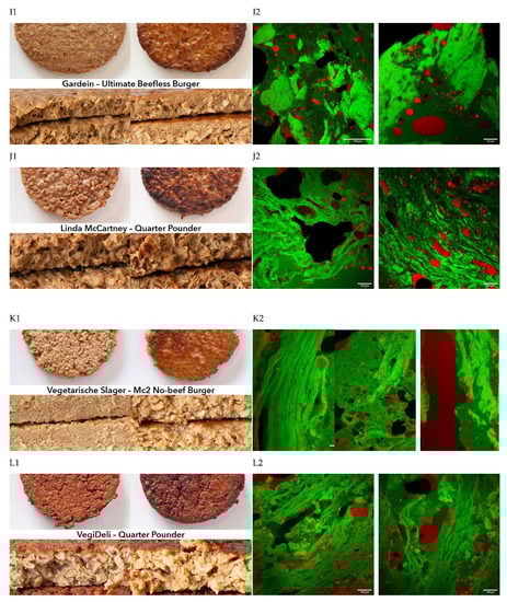 Top view and cross section of raw (left) and baked (right) products. CLSM. Pictures of the appearance of a selection of meat replacers (A–L) studied in the present research (left, 1) and CLSM micrographs of the same samples (right, 2). In the left column, the top 2 pictures are taken from the top of the products, while the lower pictures are taken from the front when the products were cut. In the right figure, representative CLSM images are given, with either a scale bar of 149 or 23 μm.