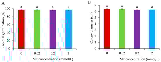 For B. cinerea infection, conidial germination is a critical step [45]. As shown in Figure 1A, with the addition of MT to the PDB liquid medium (0.02, 0.2, and 2 mmol/L), germination rates reduced slightly and decreased gradually from 97.1% to 96.2%, while the germination rate was 97.2% in PDB liquid medium. There was no significant difference (p > 0.05) among the groups. As seen in Figure 1B, the colony diameters of B. cinerea with different concentrations of MT were not significantly different among treatments at 4 d, all of which were above 6.00 cm. There was no significant difference compared to plates without MT (p > 0.05).