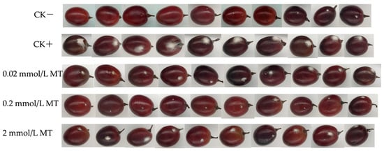 Effect of melatonin treatment on lesion development in infected “Muscat Hamburg” berries on day 3. Photographs depicting representative disease development were taken on day 3.