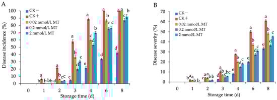 Effect of melatonin treatment on the disease incidence (A) and disease severity (B) in grape berries. Data represent means ± S.E. (n = 3). Duncan’s multiple range test was used to analyse significant differences in data, and letters above the bars represent differences at p < 0.05.