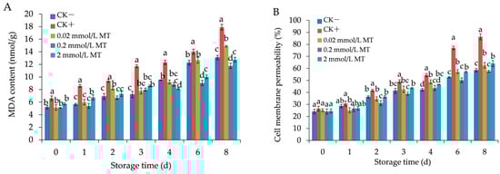 As shown in Figure 4A,B, MDA content and cell membrane permeability in all groups continued to increase during the post-inoculation period, but those in the negative control had the slowest rate of rise. MDA content treated by different MT remained at lower values than those of the positive control until the 8th day (p < 0.05), especially at 0.2 mmol/L MT treatment (Figure 4A). The MDA content in the 0.2 mmol/L MT treatment was 34.29, 28.81, and 16.89%, respectively, lower than those of the positive control group, 2 mmol/L, 0.02 mmol/L treatment on day 8. As shown in Figure 4B, cell membrane permeability treated by MT was maintained at a lower level than those in the positive control group from day 2 to day 8 (p < 0.05). A total of 0.2 mmol/L MT treatment exhibited cell membrane permeability of 43.67, 50.12, and 57.64% on days 4–8, and remained significantly lower than those in the positive control (54.43, 77.01, and 86.36%) (p < 0.05). The studies showed that MT treatment could effectively reduce MDA accumulation and increasing of cell membrane permeability.