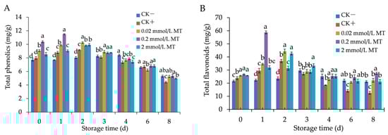 As visible in Figure 5A,B, the synthesis of total phenolics and flavonoids was remarkably increased in treatment and the positive control groups over the first 48 h and then decreased slightly after 48 h, except for those in negative control berries with a slight increase. The total phenolic content in the 0.2 mmol/L MT treatment group reached a peak on day 1, and those in the positive control, 0.02 mmol/L treatment, and 2 mmol/L treatment peaked on day 2 (Figure 5A). The peak value of the 0.2 mmol/L MT-treated group was 1.25, 1.12, and 1.16 times higher than those of the positive control, 0.02 mmol/L treatment, and 2 mmol/L treatment, respectively. Meanwhile, total flavonoid content in the 0.2 mmol/L MT treatment group peaked first (58.75 mg/g) on day 1, and the peak value was presented as a higher level compared with those of 0.02 mmol/L (44.42 mg/g), 2 mmol/L treatment (42.65 mg/g), and the positive control groups (36.96 mg/g) on day 2 (Figure 5B). These data indicated that different MT treatments could increase the synthesis of total phenolics and flavonoids over the fungal infection period, specifically the 0.2 mmol/L MT treatment.