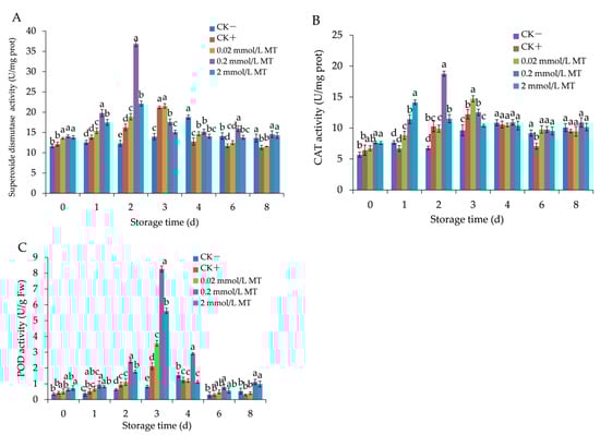 Effect of melatonin treatment on the activities of superoxide dismutase (A), catalase (B), and peroxidase (C) in grape berries. Data represent means ± S.E. (n = 3). Duncan’s multiple range test was used to analyse significant differences in data, and letters above the bars represent differences at p < 0.05.