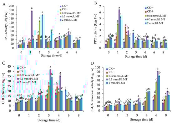 Effect of melatonin treatment on the activities of phenylalanine ammonia-lyase (A), polyphenol oxidase (B), chitinase (C), and β-1,3-glucanase (D) in grape berries. Data represent means ± S.E. (n = 3). Duncan’s multiple range test was used to analyse significant differences in data, and letters above the bars represent differences at p < 0.05.