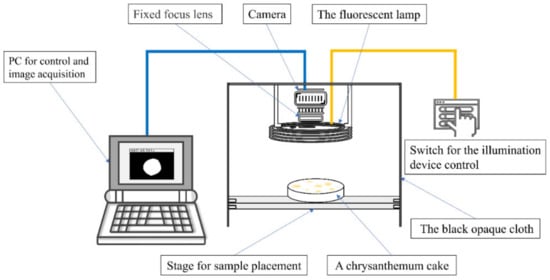 A computer vision system (CVS) equipped with an industrial camera (Basler AG, Hamburg, Germany) was employed to capture chrysanthemum images (Figure 2). Subsequently, the information of captured images was obtained using the image processing method []. The applied lens was a fixed-focus lens focused on the background plate during the image acquisition. Therefore, the total number of pixels in the white region of the binary image obtained by image segmentation was equivalent to the sum of the pixel number of chrysanthemum cakes. The process of calculating the areas of chrysanthemum cakes mainly includes the following steps: conversion to grayscale, generation of binary images, erosion and expansion operations, hole-filling operations, and calculation of the number of pixels.