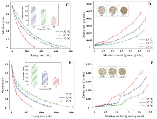 The drying characteristic curves of chrysanthemum cakes underwent different conditions, showing that the moisture content decreased from 74.86% (wet basis) to less than 10% (wet basis) with increasing drying time (Figure 3A,C,E), with drying times varying from 1080–1560, 300–750, and 660–2040 min for HAD, IR-HAD and IR-HAD + HAD, respectively. Successive increases in temperature significantly (p < 0.05) reduced drying time, especially when the temperature was increased from 55 to 75 °C, IR-HAD + HAD led to a 70.54% reduction in drying time, which may be due to the enhanced thermal driving force within the chrysanthemum cake caused by the increased temperature []. Figure 3B,D,F indicated that the drying rate gradually reduced with a decrease in the dry basis moisture content. The constant rate period was absent during the drying process of the chrysanthemum cakes. As shown in Figure 3B, a transient rising phase in the drying rate curve was observed, which was because samples were still in the warming stage. Considering the effect of drying strategies on the drying characteristics of chrysanthemum cakes, IR-HAD with the shortest drying time was found to possess a higher drying efficiency than the other drying strategies. This may be because chrysanthemum flowers are double flowers with multiple whorls, which are not conducive to heat transfer. However, infrared radiation with penetrating ability could rapidly warm up the sample by exciting the vibration and friction of water molecules []. Unfortunately, the sequential drying method (IR-HAD + HAD) was not effective in improving the drying efficiency, except at 75 °C. This phenomenon may be related to the formation of a porous structure due to the rapid moisture removal from the core to the surface in the first stage (IR-HAD) []. However, when the samples were transferred to a relatively mild drying environment (HAD), the collapse of porous structure resulting from continuous shrinkage hindered moisture migration, thus prolonging drying time [].
