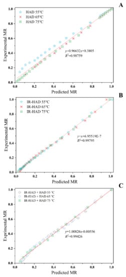 Predicted moisture ratio by Logarithmic model (A) versus experimental moisture ratio under hot air drying (HAD); predicted moisture ratio by Logarithmic model (B) versus experimental moisture ratio under combined infrared and hot air drying (IR-HAD); and predicted moisture ratio by Page model (C) versus experimental moisture ratio under sequential IR-HAD and HAD.