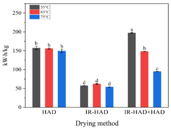 The average SEC values for different drying strategies of dried chrysanthemum cakes at different temperatures are shown in Figure 5. In terms of the effect of drying method on the SEC values, IR-HAD resulted in the lowest SEC values, regardless of drying temperature, which is related to the shorter drying time required for IR-HAD. Indeed, the correlation analysis showed a positive correlation between SEC values and drying time (r = 0.98), implying the reduction in drying time played a decisive role in reducing energy consumption. Notably, IR-HAD + HAD consumed much less energy than HAD at 65 and 75 °C, which may be related to the improved heating uniformity of the chrysanthemum cake surface by IR radiation and the removal of a large amount of moisture from the interior of the chrysanthemum cakes during the first drying stage (IR-HAD). As for the effect of drying temperature on SEC values, it can be found that SEC values show an overall decreasing trend with increasing drying temperature. Regardless of the drying method, the lowest SEC values were obtained when drying temperature was 75 °C. However, the SEC values of IR-HAD at 65 °C was higher than that at 55 °C. This was most likely because the energy consumed to heat the air was higher than the energy saved by reducing the drying time. Similar results were also reported by Wang et al. [].