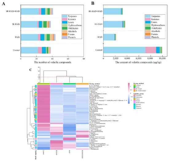 To further validate the findings obtained from PCA, an HCA dendrogram was plotted to reveal the intrinsic relationship between samples dried by different methods, using a systematic clustering model with Euclidean distance as the measurement criterion. Furthermore, a heat map was generated to visualize the distribution of volatile compounds in dried samples. As shown in Figure 6C, the four dried chrysanthemum cakes were evidently classified into three clusters at a Euclidean distance of 5.86. HAD and IR-HAD + HAD belonged to one group, while both FD and IR-HAD belonged to different groups. These results were consistent with those observed from PCA. In addition, the heat map showed that concentration of volatile compounds in FD-dried samples exhibited a darker red color, implying that FD provided higher concentrations of volatile compounds compared to other drying methods. Interestingly, HAD-dried and IR-HAD + HAD-dried samples were not differentiated, implying that the aroma profile of the samples dried by both drying methods were relatively similar. However, IR-HAD-dried samples were separated from the HAD-dried and IR-HAD + HAD-dried samples, and the concentration of volatile compounds in IR-HAD-dried samples showed a darker red and a lighter blue color, indicating a higher level of volatile compounds in IR-HAD-dried samples. These findings suggested that IR-HAD possessed a considerable potential for preserving the volatile compounds in dried chrysanthemum cakes.