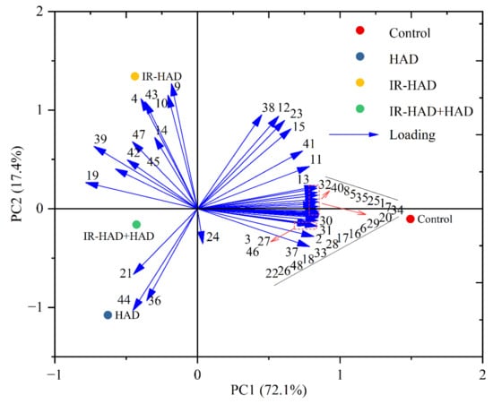 PCA is a well-established data dimensionality reduction algorithm that transforms a set of potentially correlated variables into a set of uncorrelated variables through an orthogonal transformation, and the new variables after the transformation are called principal components (PCs) []. Essentially, PCs are linear combinations of the original variables (i.e., the concentration of volatile compounds). PCA was performed using Origin 2021 software (Origin Lab, Northampton, MA, USA) to calculate the PCs of volatile compounds in dried chrysanthemum cakes, which mainly consisted of constructing matrices, centering the measurement types and calculating PCs using singular value decomposition (SVD).