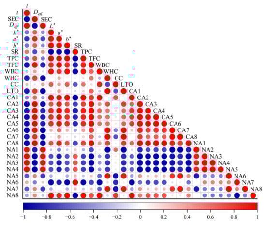 Pearson correlation analysis on various parameters of chrysanthemum cakes dried by different methods. t: drying time; Deff: effective moisture diffusivity; SEC: specific energy consumption; L*: lightness; a*: redness/greenness; b*: yellowness/blueness; SR: shrinkage ratio; TPC: total phenolic compounds: TFC: total flavonoid content; WBC: water binding capacity; WHC: water holding capacity; CC: chlorogenic acid; LTO: luteolin; CA: the content of volatile compounds; NA: the number of volatile compounds; 1: terpenes; 2: ketones; 3: esters: 4: hydrocarbons; 5: aldehydes; 6: alcohols; 7: furans; 8: phenols.