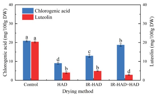 The contents of chlorogenic acid and luteolin in chrysanthemum cakes dried by different methods. Control: freeze-drying; HAD: hot air drying at 65 °C; IR-HAD: combined infrared and hot air drying at 65 °C; IR-HAD + HAD: sequential IR-HAD and HAD at 65 °C. Different lowercase letters (a–d) represent significant differences between the values of different drying methods (p < 0.05).