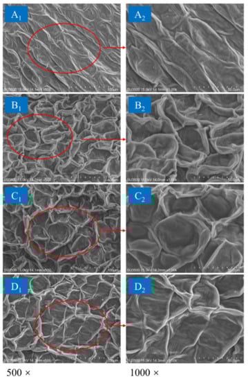 The calculated SR values of dried chrysanthemum cakes under different drying conditions are illustrated in Table 2, which varied from 16.26 to 34.10%. For chrysanthemum, the marginal florets appeared irregularly curled during drying because of its sparse parenchyma, and the undeveloped protective tissue led to the collapse of the surface structure. Meanwhile, the space previously occupied by moisture was constantly emptied and inflated, finally inducing shrinkage of the overall structure [].