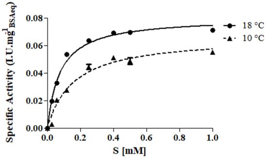 Kinetic parameters of protease tested at two different temperatures: 10 °C (cold settling prior to AF) and 18 °C (AF). Assay was performed in model wine must (tartaric buffer 0.3 M, pH 3.2) added with the synthetic chromogenic substrate Z-Gly-Pro-pNA (0–1 mM).