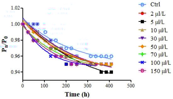 Time course of weight loss (ratio between the current and initial weight (Pn/P0) against time (t)) representing sugar consumption during the alcoholic fermentation (18 °C) of Riesling Italic must (treatment II, at yeast inoculum) at different protease dosages (2–150 μL/L).