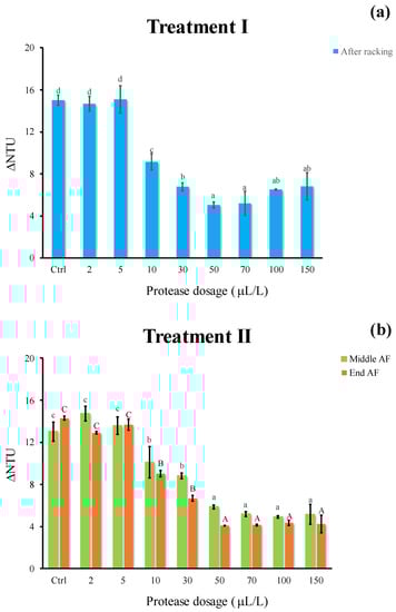 Concerning treatment I, a significant reduction in protein instability was found adding protease (Figure 3a) at dosages above 10 μL/L. The lowest ΔNTU (5.1) was observed at 50 μL/L, whereas no further stabilizing effect was revealed at highest dosages. The cold settling in presence of the pectinolytic enzyme alone (Ctrl) lowered the protein instability (ΔNTU = 15) as compared to the turbid pressed grape juice (ΔNTU = 21.3, data not shown). Similar results were observed for the treatment II (evaluated at the middle/end of AF), with the lowest ΔNTU values (5.9 and 4.1, respectively) at 50 μL/L, corresponding to a 75–83% instability removal (Figure 3b). No further ΔNTU reduction was found at increasing proteolytic enzyme dosage (Figure 3b). Several studies have investigated the effectiveness of different proteolytic enzymes in free or immobilized form as an alternative treatment to bentonite fining for white wine protein stabilization. Benucci et al. [17] tested the feasibility of stem bromelain, free or immobilized on chitosan support, to reduce white wine protein haze potential (approximately 70%). Marangon et al. [14] demonstrated that the simple addition of AGP (a mixture of Aspergillopepsins I and II) during fermentation yielded a protein hydrolysis of about 20%.
