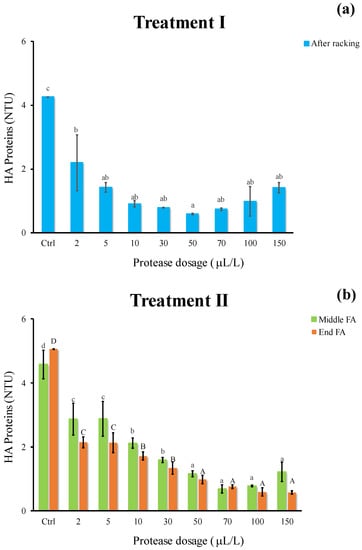 Similar to that observed for protein instability, the decrease in HA proteins appeared remarkable adding protease (Figure 4). Irrespective of the oenological phase, the proteolytic enzyme had a significant effect in breaking down HA proteins (Figure 4a,b) and the most effective dosage resulted as 50 μL/L (0.6 NTU). The efficacy of protease and pectinase in beverages has been highlighted by the literature. Both enzymes significantly decreased the amount of HA proteins (−75%) in pomegranate juice treated in fluidized bed reactor [26].