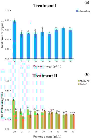 Total proteins (mg/mL) of white must wine subjected to enzymatic addition (protease in the range of 2–150 μL/L) after (a) Treatment I (cold settling prior to AF) and (b) Treatment II (at yeast inoculum). Ctrl is clarified must with the only pectinolytic enzyme. For each sample, means with different roman letters are significantly different (p ≤ 0.05).