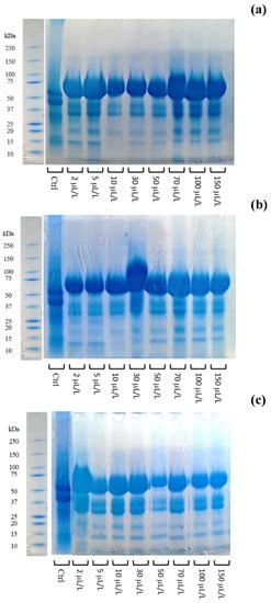 Electrophoretic profile under denaturing conditions of white must-wine subjected to enzymatic addition (protease in the range of 2–150 μL/L) after (a) treatment I (cold settling prior to AF, evaluated at racking after 24 h settling), (b) treatment II (at yeast inoculum, evaluated at middle AF) and (c) treatment II (at yeast inoculum, evaluated at the end AF). Ctrl is clarified must with the only pectinolytic enzyme.