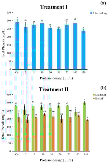Total phenols (mg/L) of white must wine subjected to enzymatic addition (protease in the range of 2–150 μL/L) after (a) treatment I (cold settling prior to AF) and (b) treatment II (at yeast inoculum). Ctrl is clarified must with the only pectinolytic enzyme. For each sample, means with different roman letters are significantly different (p ≤ 0.05).