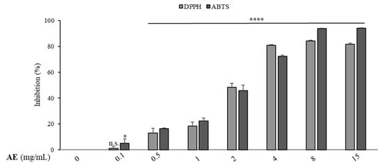 Changes in %IDPPH and %IABTS of AE at different concentrations. Extract I% vs. initial concentration of ABTS or DPPH (0). The values represent the means ± SDs of three different experiments, each performed in triplicate. n.s.: not significant; * p < 0.05; **** p < 0.0001.
