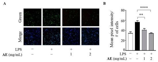 Based on the IC50 values of the AE against DPPH and ABTS radicals, we assessed the antioxidant effects of the extract at 1 and 2 mg/mL on human THP-1 macrophages stimulated by LPS into M1 macrophages as an in vitro model system of oxidative stress able to produce reactive oxygen species (ROS) [55]. As shown in Figure 3, LPS increased the production of intracellular ROS in human M1 macrophages, whereas AE at both concentrations significantly inhibited the ROS production induced by LPS (p < 0.005, p < 0.0001, respectively).