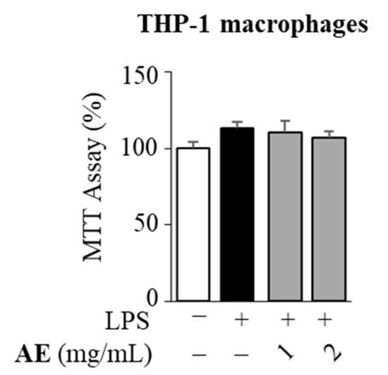 In order to exclude any cytotoxic effects on cells upon treatment with AE, its biological effects were assessed in LPS-stimulated macrophages by MTT assay. The exposure of cells for 24 h to AE, at concentrations of 1 and 2 mg/mL, did not hamper cell viability (Figure 4).