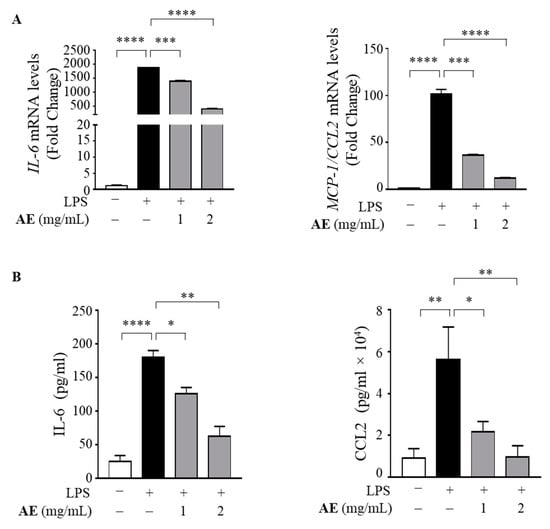 To investigate the potential anti-inflammatory effects of AE, the gene and protein expression levels of pro-inflammatory cytokines were measured by qRT-PCR and ELISA, respectively, in human M1 macrophages treated with 1 and 2 mg/mL of AE. As expected, the treatment with LPS induced the expression of Interleukin (IL)-6 and Monocyte Chemoattractant Protein (MCP)-1/C-C motif chemokine ligand 2 (CCL-2) in M1 macrophages, whereas AE was able to dampen the inflammation in a concentration-dependent manner (Figure 5A). Consistently with these results, it was also found that AE reduced the IL-6 and MCP-1 protein secretion induced by LPS, suggesting its anti-inflammatory effect in macrophages (Figure 5B).