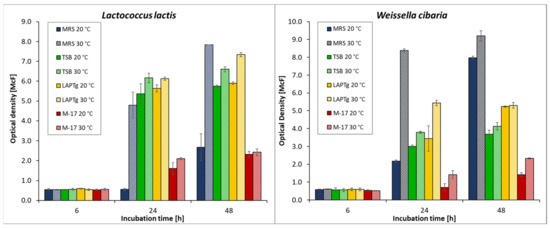 The ability of the selected LAB to grow under various culture conditions was assessed by measuring optical density (OD). Measuring the OD at 565 nm is the most common method for estimating the concentration of cells in a suspension liquid [24]. For the growth assessment of L. lactis and W. cibaria, four different culture media (MRSB, TSB, LAPTg and M17), two temperatures (20 °C and 30 °C), and three measurement points (6, 24, and 48 h) were selected. During the measurements, the effect of the background absorbance by the pure medium was taken into account (MRS—1.1; TSB—0.28; M-17—6.63; LAPTg—0.68). For all strains, an increase in optical density was observed with increasing cultivation time. The degree of growth depended on the medium used and the incubation temperature.