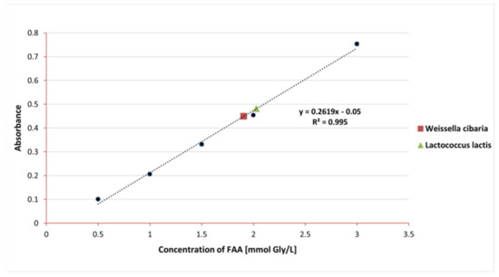 From an industrial point of view, proteolytic activity is an advantageous feature of LAB strains. In the dairy industry, proteolytic properties play a key role in ensuring successful fermentation. Proteolytic enzymes secreted by bacteria release peptides and amino acids from casein, which are involved in creating the aroma, texture, and taste of the final product [25]. The proteolytic properties of the tested strains were determined by means of a spectrophotometric test with the o-PA reagent. The concentration of FAA was calculated based on the equation of the glycine standard curve and the obtained absorbance results. The result for L. lactis was 2.01 ± 0.002 mmol Gly/L FFA, and for W. cibaria 1.91 ± 0.01 mmol Gly/L FFA (see Figure 3).