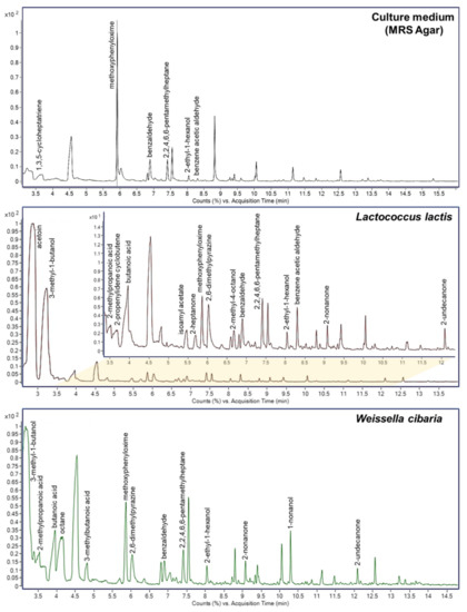 Lactic acid bacteria produce volatile organic compounds (VOCs) by fermenting various products. Their composition is responsible for the taste, smell, and texture of fermented products, e.g., dairy products. VOCs produced by L. lactis and W. cibaria strains were analyzed using gas chromatography (GC). A control analysis of an applied culture medium was also performed. The peaks in the chromatograms were matched with compounds in the NIST 17 library (see Figure 4). Sixteen compounds were identified in the L. lactis chromatogram and thirteen in W. cibaria. They were mainly alcohols, ketones, acids, and aldehydes. Ten of the identified compounds were present in both LAB strain samples. Six compounds were identified in the control sample. Four of them (methoxyphenyloxime, benzaldehyde, 2,2,4,6,6-pentamethylheptane, and 2-ethyl-1-hexanol) were also identified in samples of both LAB strains. In the case of the L. lactis strain, benzene acetic aldehyde was additionally identified, which was also present in the control sample.