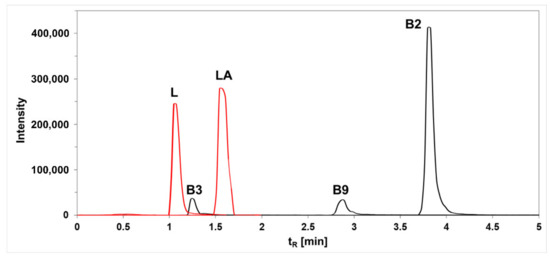 Exemplary chromatograms obtained during the analysis of selected compounds by HPLC. L—lactose; LA—lactic acid; B2—riboflavin; B3—niacin; B9—folic acid; tR—retention time.