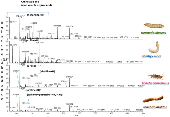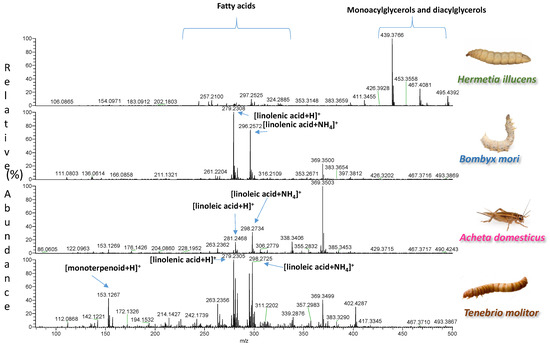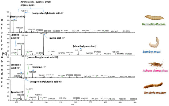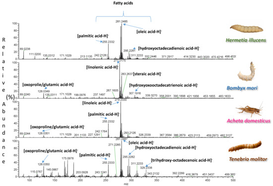 In detail, Tenebrio molitor powders were characterized by a high relative abundance of protonated and deprotonated proline, as well as deprotonated glutamic acid. Ammoniated butyric acid, deprotonated palmitic acid, and linoleic acid were the compounds that contributed the most to the identification of Acheta domesticus. Bombyx mori powders were differentiated by highly abundant polyunsaturated linolenic acid and deprotonated quinic acid (Table 1). Deprotonated lactic acid, palmitic acid, oleic acid, and monoacylglycerol MAG (24:1) characterized the Hermetia illucens powders (Table 1).