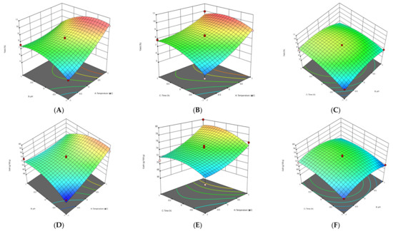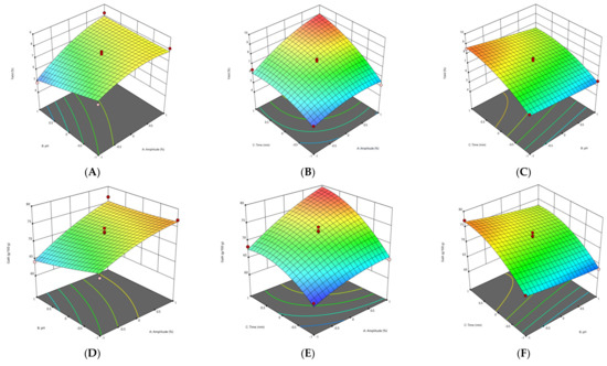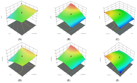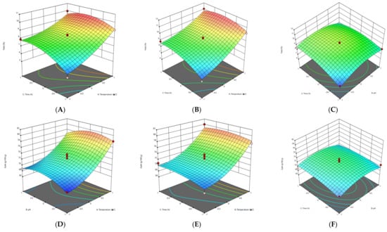 The response surface methodology (RSM) plots (Figure 1, Figure 2, Figure 3 and Figure 4) were used for the analysis of the influence of the independent variables on the pectin characteristics (extraction yield, GalA, DE and Mw. The three-dimensional graphics of extraction yield of Fetească Neagră (FN) and Rară Neagră (RN) pectin extracted by CE and PUAE are shown in Figure 1A–C, Figure 2A–C, Figure 3A–C and Figure 4A–C, respectively. As the results of 3D graphics and the ANOVA in Appendix B indicate, all the applied variables highly influenced the pectin yield. Extraction yield had a range between 5.43% (temperature of 70 °C, pH 2 for 1 h) and 9.96% (temperature of 90 °C, pH 2 for 3 h) for FN pectin, while for RN pectin, yield varied between 6.61% and 11.08% for similar extraction conditions by CE. Moreover, the yield of pectin obtained under PUAE presented values between 4.90% (amplitude of 60%, pH 3 for 20 min) and 8.83% (amplitude of 100%, pH 2 for 60 min) for FN pectin, while the range was between 5.16% (amplitude of 100%, pH 2 for 20 min) and 8.94% (amplitude of 100%, pH 2 for 60 min) for RN pectin.