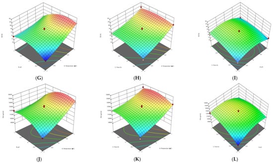 3D graphs showing the influence of extraction parameters on the yield (A–C), GalA content (D–F), DE (G–I) and Mw (J–L) for FN pectin extracted by CE.