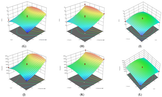 3D graphs showing the influence of extraction parameters on the yield (A–C), GalA content (D–F), DE (G–I) and Mw (J–L) for RN pectin extracted by CE.